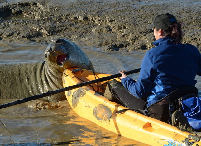 Barbie Halaska of the Marine Mammal Center tries to coax an elephant seal back toward the bay after it came up Tolay Creek near the Sonoma Raceway in Sonoma, Calif. on Tuesday, Dec. 29, 2015. (Alan Dep/Marin Independent Journal)